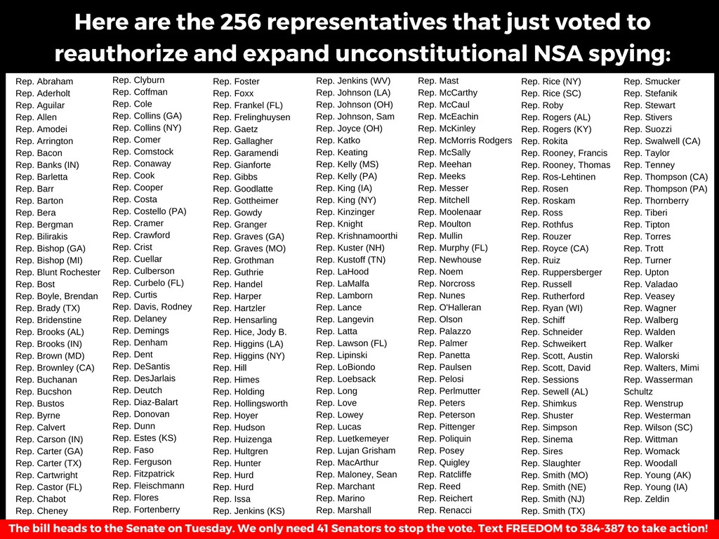 Here are the 256 representatives that just voted to reauthorize and expand unconstitutional NSA…