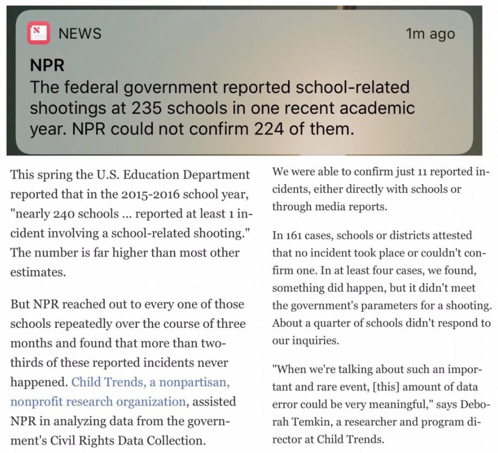 In a rare example of actual journalism, NPR admits that nearly 90% of the “school shootings” we hear about when gun-control activists cite absurdly high numbers never actually happened. : conspiracy